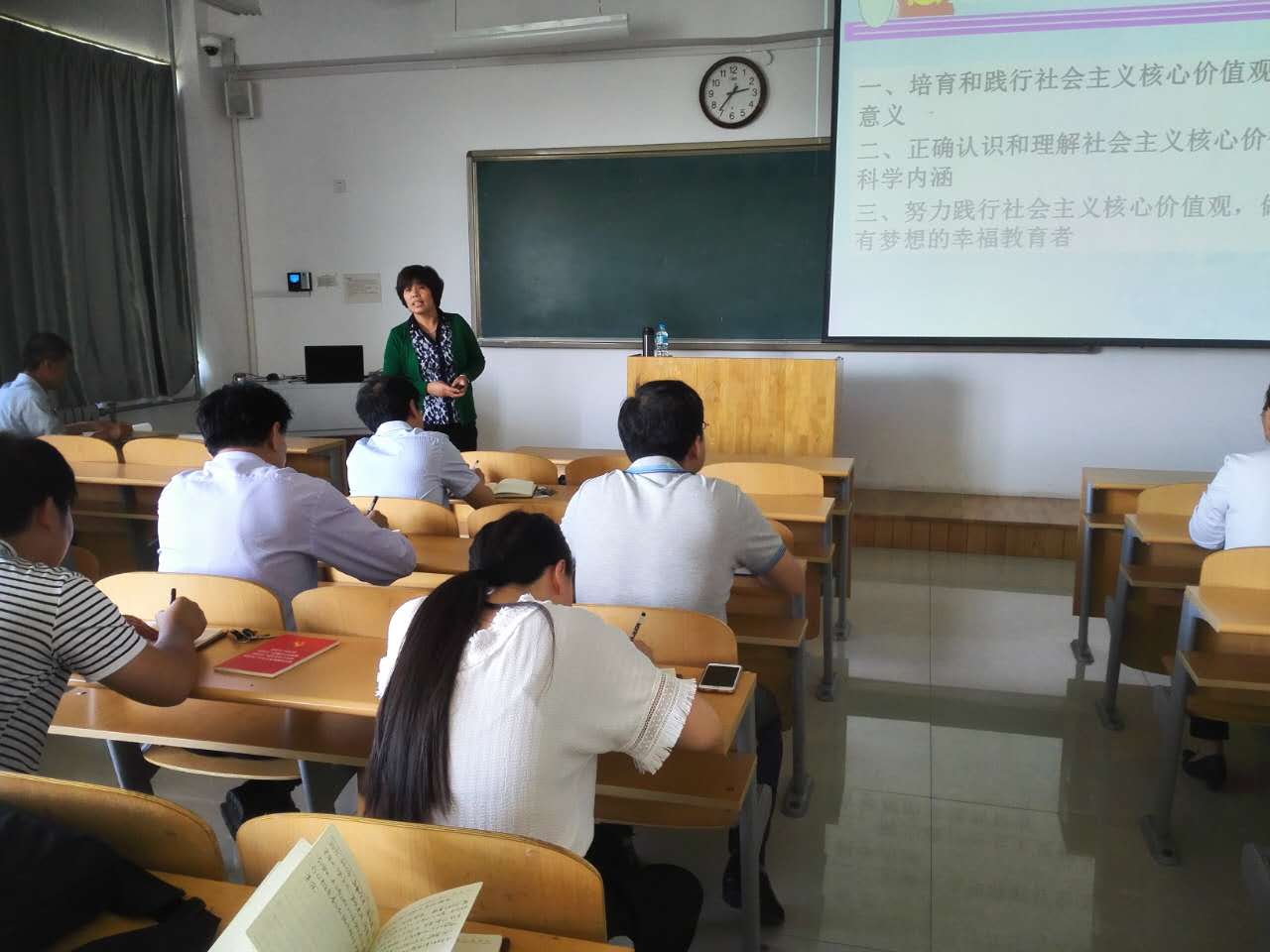 许翠玲教授讲解了培育和践行社会主义核心价值观的重要意义、正确认识和理解社会主义核心价值观的科学内涵;最后提出努力践行社会主义核心价值观,做一个有梦想的幸福教育者,做有理想信念、有仁爱之心、有道德情操和扎实学识的人民满意的好老师。