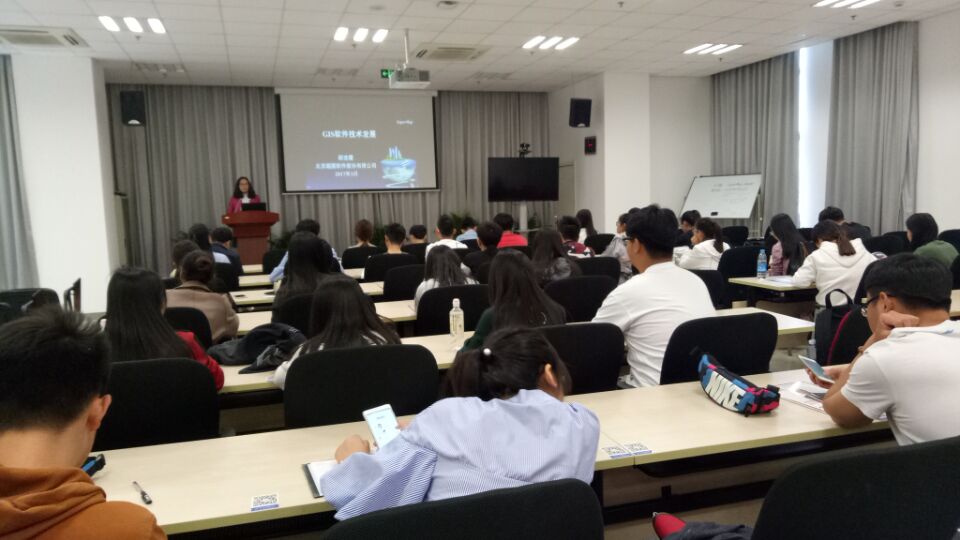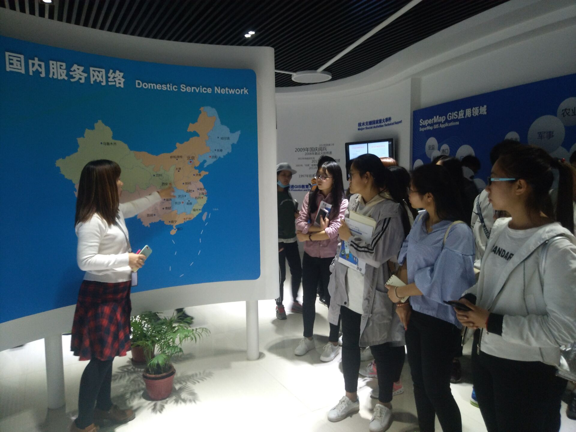 教育推广主管郭蕊热情接待了我校师生。在郭蕊的带领下,师生们参观了公司文化展厅,了解了公司历史和战略文化,体验了超图开发的酷炫三维建模技术,参观了舒适的公司办公环境。郗连霞作了的主题报告,介绍了超图的云GIS平台、在线云服务、二三维一体化以及桌面版iDesktop Cross等代表性技术,让师生们接触到GIS行业前沿。在问答环节,超图公司员工仔细回答了师生们关于产品优势、行业发展、就业等方面的问题,并表示愿意为同学们提供一定的实习和就业机会。
