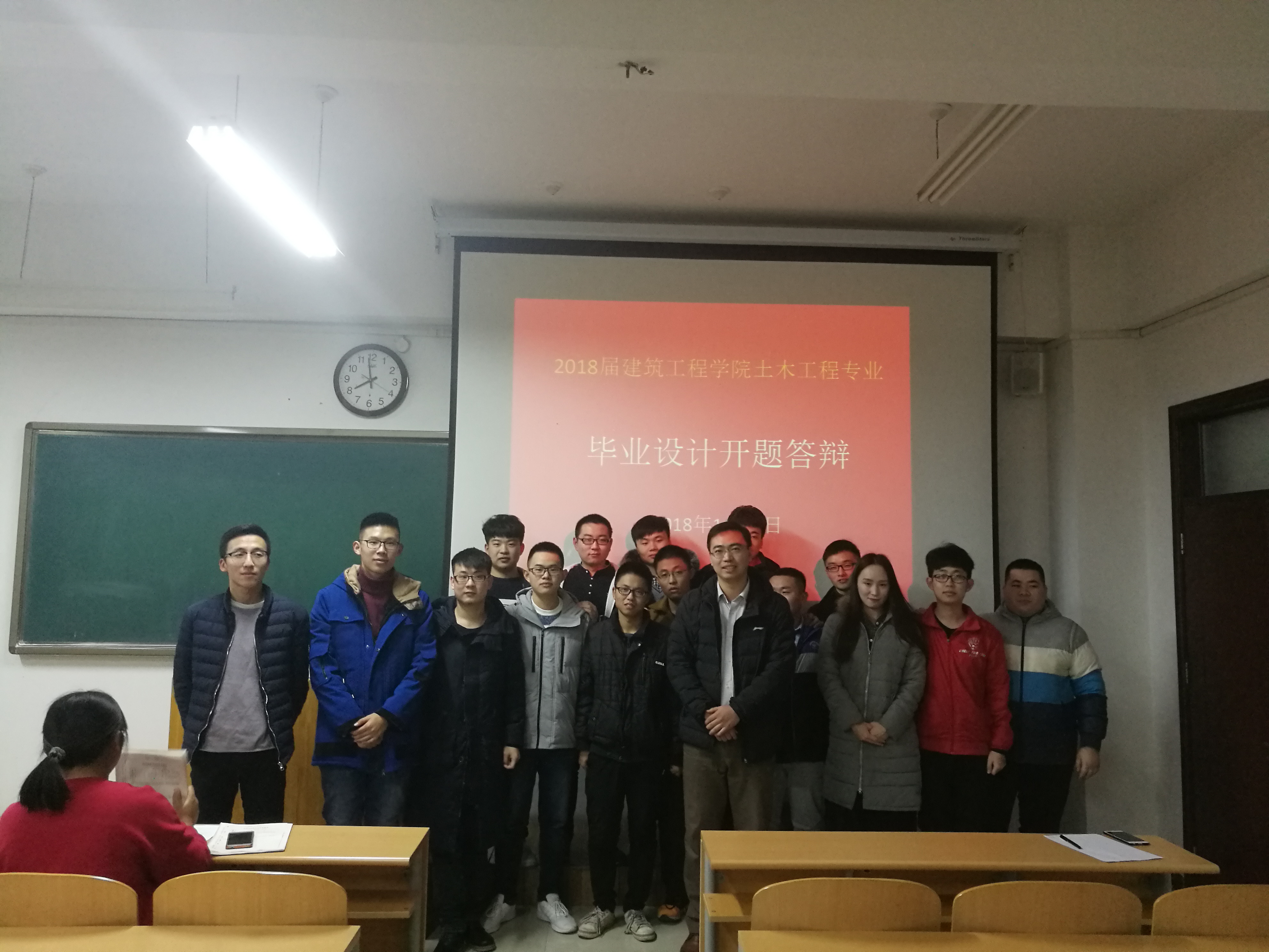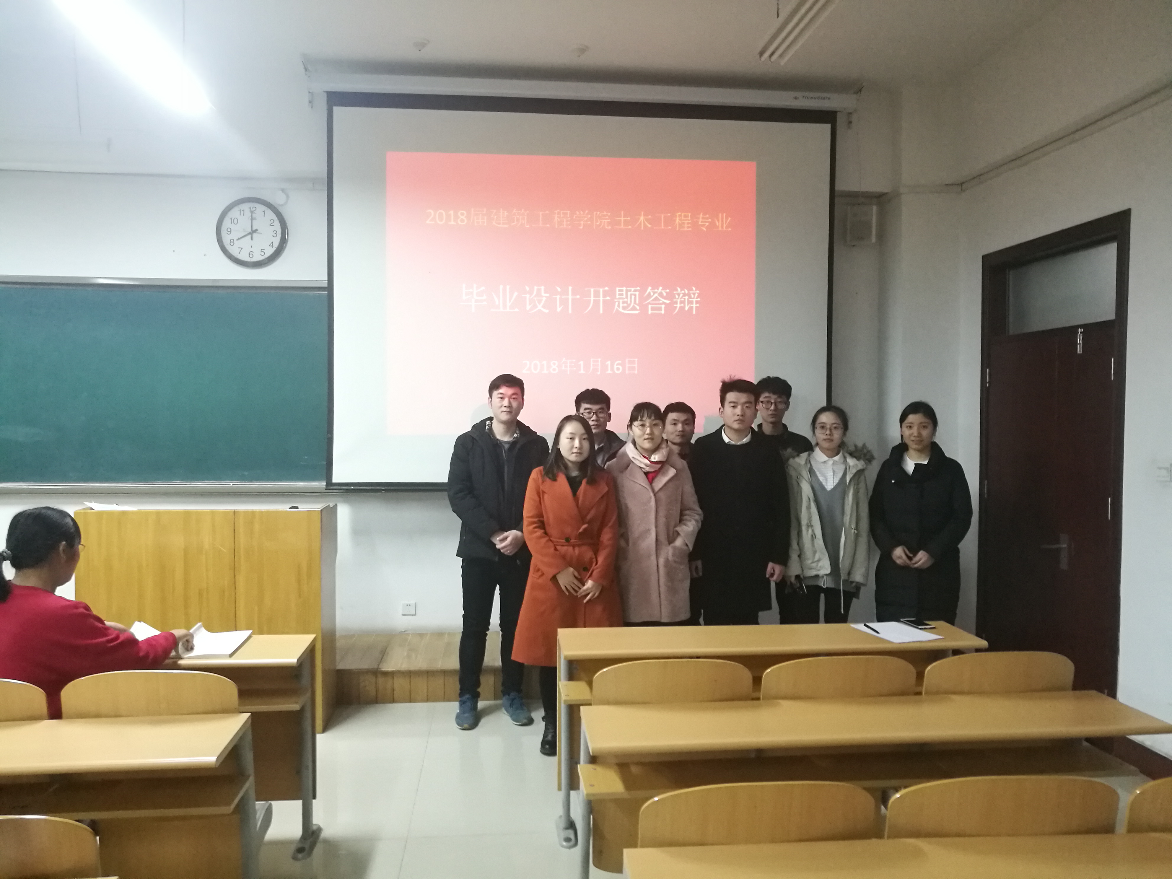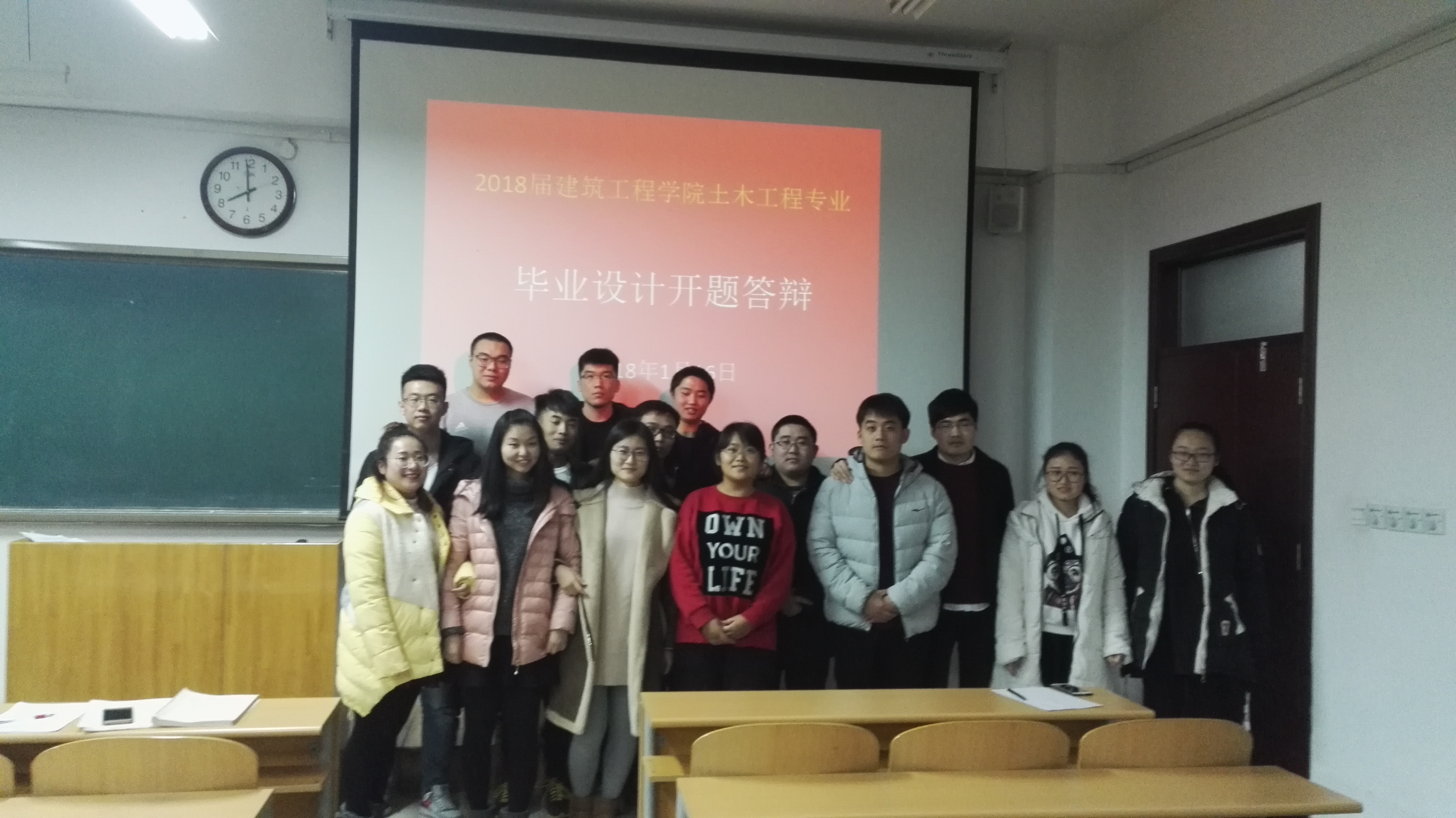 1月16日,我院土木工程专业2018届本科生毕业论文开题答辩在8号教学楼举行,张忠坤教授、邢雪阳博士、李晓飞博士、袭金真高工作为指导教师参加答辩会,共有60名毕业生参加了此次开题答辩,其它毕业生论文开题答辩工作也将陆续展开。答辩现场严肃而温馨,同学们认真准备,展示出了选题创意,指导老师互动提问,同学们进一步明确了毕业设计的内容、目标和设计方法,为下一步顺利完成毕业设计提供了保障。