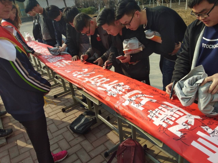 签字活动现场秩序井然,各项安排井井有条,每位参与人员都精神饱满,热情高涨。学生会的所有成员遍布活动现场各角落,向师生发出号召,邀请我院师生在条幅上签下自己的名字,鼓励广大师生向雷锋同志学习,做新时代的好榜样。同学们踊跃参加活动,在主题横幅上签下自己的姓名,以此表明自己学习雷锋精神、深化志愿服务的决心。