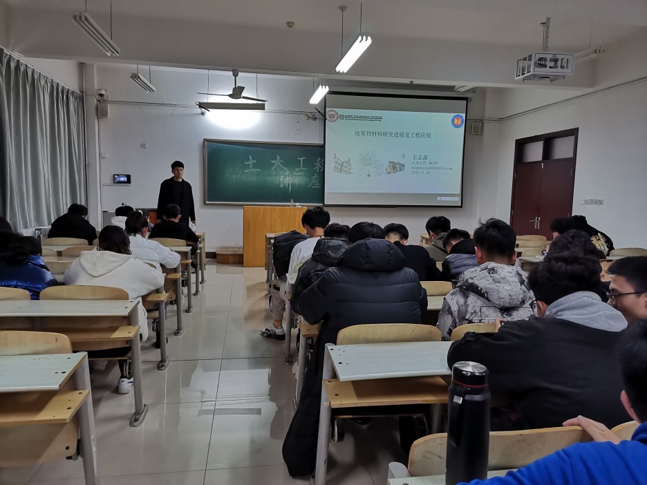 然后,王老师介绍了他目前的研究方向——地聚物的相关信息,包括其化学式、合成过程等。指出地聚物用于土木工程的相关优缺点,说明了研究此项目的用途和未来的前景。