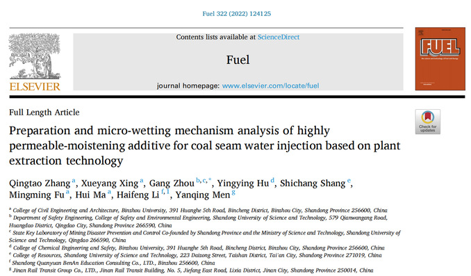 近日,我院张清涛老师以第一作者在国际能源与燃料类期刊《Fuel》(中科院1区TOP期刊、IF=8.035)发表了题为《Preparation and micro-wetting mechanism analysis of highly permeable-moistening additive for coal seam water injection based on plant extraction technology》的论文。该论文基于自由基聚合-接枝共聚理论研发了新型强渗增润型表面活性剂,能够进一步降低煤矿开采中的粉尘浓度,改善工作环境,保障矿工的职业安全和健康,提高智能矿山的安全建设水平。