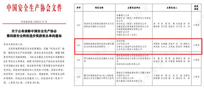 近日,由中国安全生产协会主办的第四届安全科技进步奖获奖名单揭晓,我院邢雪阳教授团队主持的《裂隙软弱围岩损伤变形机理及耦合支护稳定性控制研究》项目从1550个申报项目中脱颖而出,荣获二等奖,实现了我院省部级奖项的历史新突破。