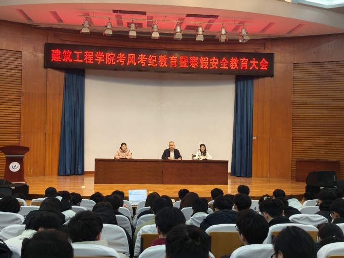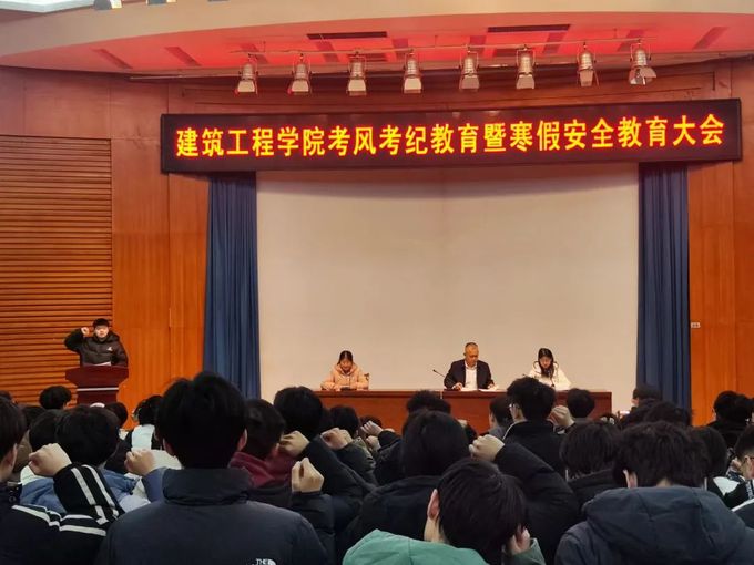 为进一步加强学风建设,强化学生诚信应考意识,杜绝作弊行为,确保教育评价的公正公平,12月22日,建筑工程学院在明德报告厅召开考风考纪教育暨寒假安全教育大会,党委副书记、全体辅导员,全体非毕业班学生参加。