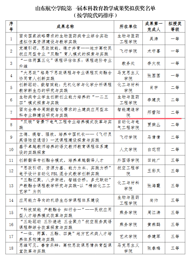 近日,太阳集团第一届本科教育教学成果奖公布评选结果,共评选出校级教学成果奖18项,其中一等奖4项、二等奖6项、三等奖8项。我院申报的成果“面向全寿命周期数智化需求的土建类应用型本科专业群建设研究与实践”获得二等奖。